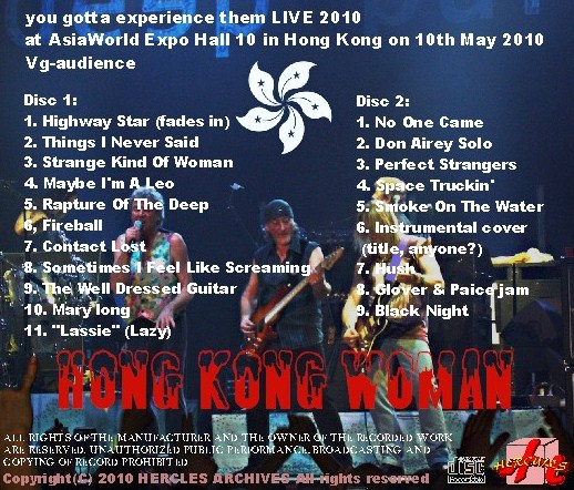 2010年DEEP PURPLEアジアツアー5月10日 香港でのコレクターズCDとなります。ギタリスト スティーヴ・モーズも加入し8年が過ぎすっかりDEEP PURPLEの顔となり通算 第9期DEEP PURPLEとして毎年積極的に世界中をツアーしていますが、ここ数年は、必ずと言って良いほどアジアでのライブを披露しています。今まであまりロックには、閉鎖的だった地区だけあり観客の盛り上がりは、絶好調で又、メンバーも観客の反応に気分が良いのか一体感のあるライブコンサートです。新旧ヒット曲を織り交ぜ、まるで70年代前期のようなとても乗りの良いコンサートです。特に後半にGlover & Paiceが Jamを披露したり、又イアンギランも声の調子が良く途中声がひっくり返ることなく安定したプレーを聞かせてくれます。2010年の前半のツアーですので時期的には安定した時期のコンサートでは無いでしょうか?お勧めです。soundqualityは、audience収録ですが極端なイコライジング処理も無く終始安定した収録でこもりも無くとても聞きやすい音源です。