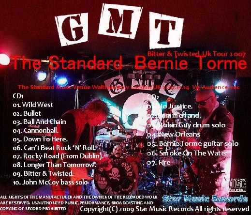 Bernie Torme(バーニー・トーメ)率いるGMT(Guy, McCoy, Torme)の2007年12月14日London Walthamstow The Standard Music Venueでのアルバム「Bitter & Twist」リリース直前のUKツアーを収録したコレクターズCDとなります。Gillanの巨漢ベーシストJohn McCoyをフューチャーしてのGMT(Guy, McCoy, Torme)のsoundは、ギターフリークにはたまらないsoundで「これぞRock」と思わず叫びたくなるライブを披露し往年のBernie Torme(バーニー・トーメ)のギタープレーをたっぷり堪能できます。soundqualityは、audience収録ですがライブ会場がそんなに大きくないキャパシティの様で臨場感たっぷりにクリアーにライブを堪能できます。おそらくTormeの立ち位置のせいか若干ヴォーカルが下がっているように聞こえますがさほど気になるほどではありません。それ以外は、ハードにエネルギッシュに収録され素晴らしいコンサートを堪能できます。お勧めです。