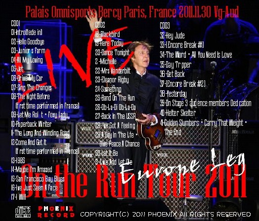 2011年Paul McCartney(ポール・マッカートニー)のヨーロッパツアー 11月30日Palais Omnisports Bercy Paris, Franceでのライブを収録しています。ヨーロッパツアーが開始し テンション全開と言うべきパフォーマンスを披露しています。とても調子が良いのか最初から飛ばしているなぁーと感じるコンサートです。新旧ヒット曲を織り交ぜたsetlistは、大きな変更は、ありませんが珍しく「Come And Get It 」が披露されるなどとても楽しめる構成となっていてこのリラックスした中にもこんなにもドラマチックな展開は、ポールならでは、ではないでしょうか?soundqualityは、Aud収録ですがとても臨場感ある収録でごく自然に聞く事が出来ます。クリアー感のバランスもよくこもり感も無く堪能できます。