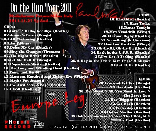 (ポール・マッカートニー)2011年 On the Run Tour ヨーロッパ公演 イタリア最終日 11月27日Mediolanum Forum:Milan Italyでのライブを収録しています。 こんなにも「イタリアのaudienceは、激しいのか」と思うほど、とても盛り上がったコンサートでポール自身のテンションも絶好調です。とても出来の良いコンサートで2011年を象徴するライブです。soundqualityは、Aud収録でとても迫力ある収録で臨場感があり、まるで会場で聞いているかの如く堪能できます。